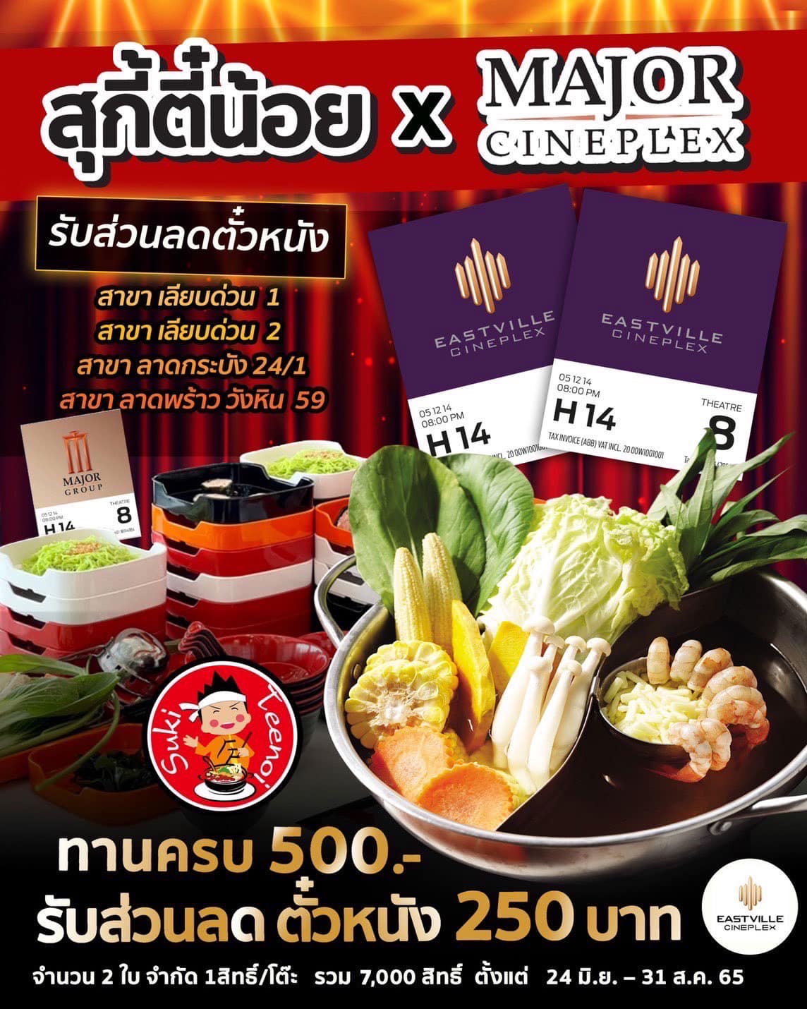 สุกี้ตี๋น้อย X Major Cineplex จัดแคมเปญพิเศษสุดว้าว อิ่มคุ้มสุดฟินกับสุกี้ตี๋น้อยกันเเล้ว รับฟรีคูปอง ส่วนลดตั๋วหนัง มูลค่า 250 บาท จำนวน 2 ใบ เมื่อทานครบ 5...